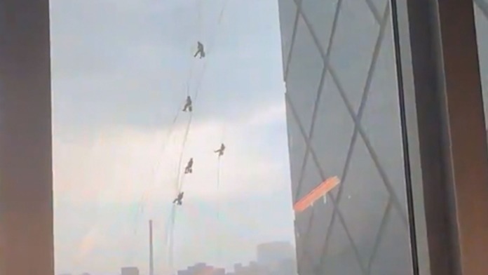 Un grupo de 13 trabajadores de mantenimiento que se encontraban limpiando los ventanales del edifico de la CCTV, televisora estatal china, quedaron colgando a más de 200 metros del suelo sólo con cuerdas después que Pekín fuera azotada por una tormenta durante en la tarde del jueves 30 de mayo. La gente que se encontraba alrededor del inmueble grabó la aterradora escena.