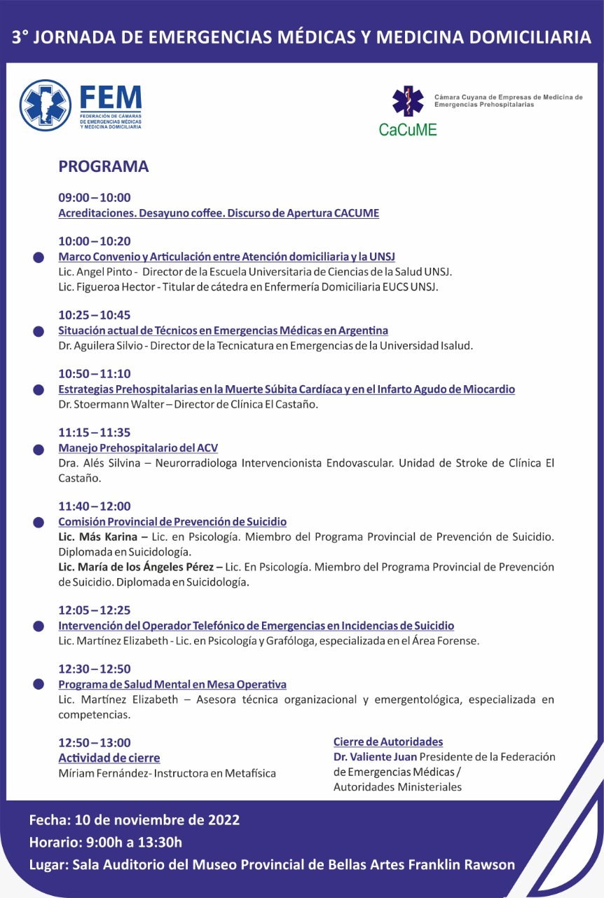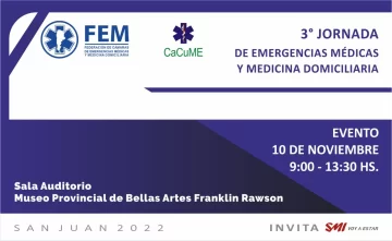 Este jueves 10, organizada por la Federación de Cámaras de Emergencias Médicas y Medicina Domiciliaria (FEM) y la Cámara Cuyana de Empresas de Medicina de Emergencias Prehospitalarias (CaCuME), se realizará la “3° Jornada de Emergencias Médicas y Medicina Domiciliaria”. La misma tendrá lugar en el Salón Auditorio del Museo de Bellas Artes Franklin Rawson, ubicado en Av. Libertador Gral. San Martín 862 Oeste, Capital, en horario de 9 a 13:30hs.