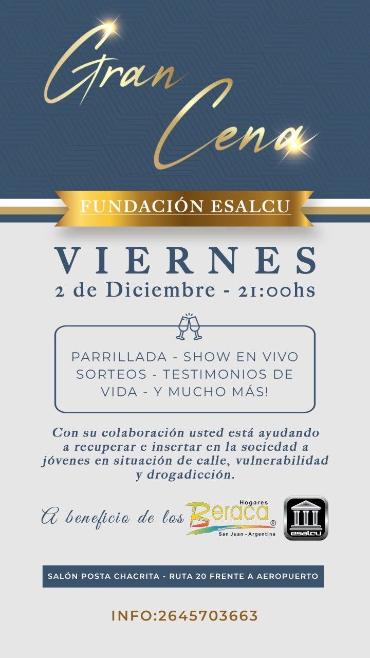 El viernes 2 de diciembre a las 21hs en Posta Chacrita, se realiza la Cena de la Fundación Esalcu, destinada a dar a conocer la tarea social que se lleva a cabo en los hogares y también brindar la posibilidad de interactuar con los jóvenes que los integran. Para comprar el bono, con un valor de $6.000, deben comunicarse al teléfono: 264 5703663