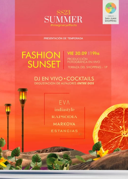 Espacio San Juan Shopping presenta una tarde distinta para este viernes 30 de septiembre. Es que con motivo de la presentación de la Nueva Temporada Primavera Verano 22-23 se realizará un FASHION SUNSET a las 19hs, un atardecer en las terrazas del shopping, con mucha moda, de la mano de las mejores marcas: Markova, Rapsodia, Eva Miller, Indiastyle y Estancias, en una sesión de fotos en vivo.