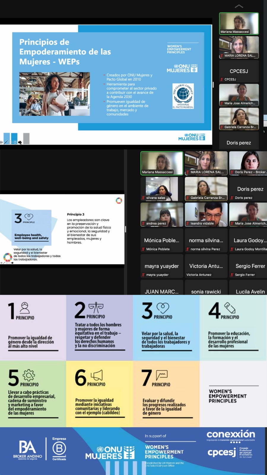 El miércoles 6 de diciembre, se desarrolló la charla online gratuita “LA IGUALDAD DE GÉNERO EN LA GESTIÓN EMPRESARIAL”, un evento organizado por ONU Mujeres, Broker Andino, Conexxión y la Comisión de Mujeres del Consejo Profesional de Ciencias Económicas que tuvo como disertante a Mariana Massaccesi, especialista en género para el sector privado de ONU Mujeres, asesora en el diseño de estrategias de igualdad para organismos internacionales, gubernamentales, empresas y principal referente en Latinoamerica del programa WEPs: Women´s Empowerment Principles (Principios de Empoderamiento de las Mujeres) cuya finalidad es promover la igualdad de género en los ambientes de trabajo, mercado y comunidades, a través de la formación de una consciencia global y el empleo de herramientas para el sector empresario, que lo comprometen en el avance de la agenda 2030.