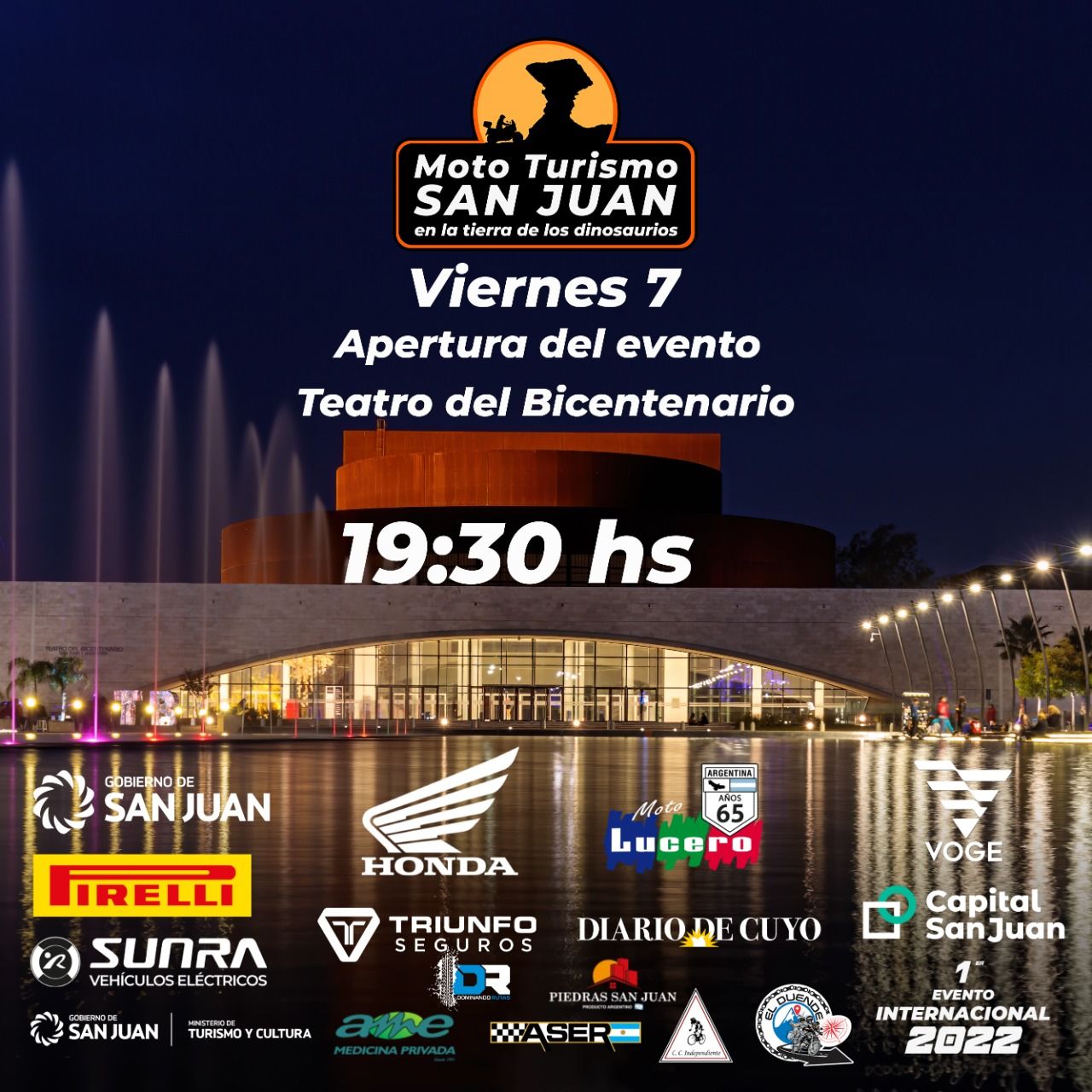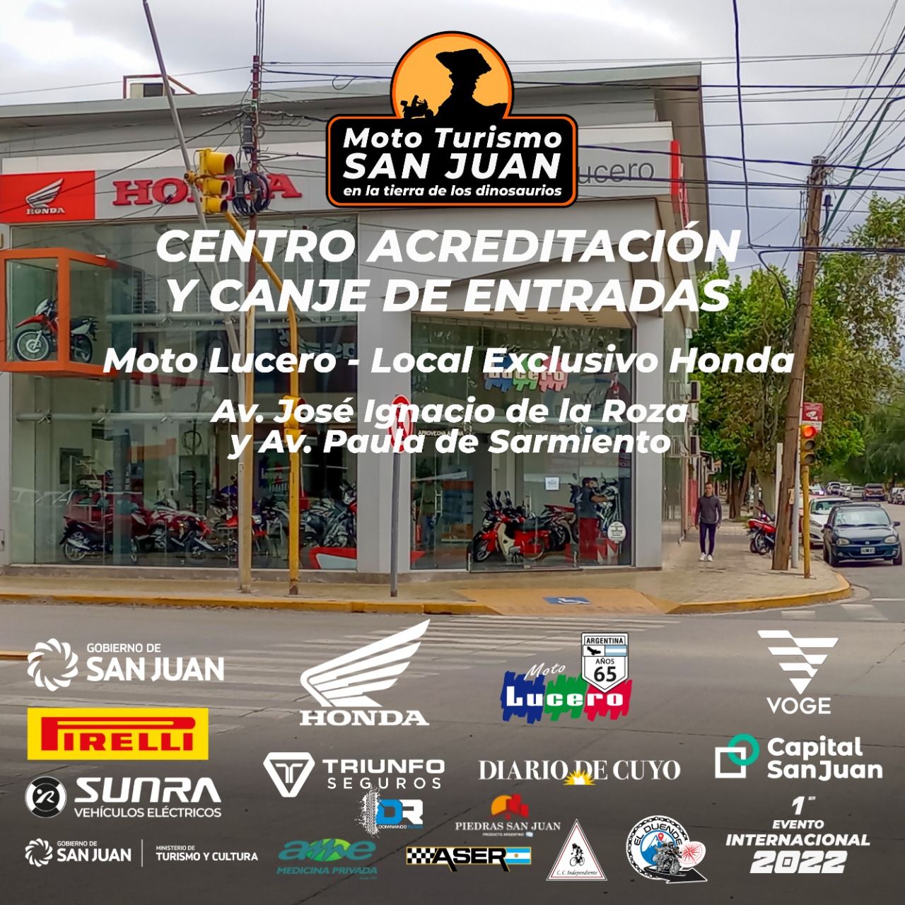 Por la mañana nos concentraremos para partir desde el puente del teatro Bicentenario, con la caravana turística junto a nuestro padrino Pablo Imhoff y demás referentes y YouTubers moto viajeros hacia los diques Ullum y Punta Negra. Pasando por los municipios de Ullum y Zonda. Sacaremos la foto panorámica del grupo y regresaremos pasando por la famosa quebrada del Zonda en el municipio de Rivadavia hasta llegar al Predio Ex-Bodega Cinzano, donde nos recibirá un show de música en vivo con bandas, de diferentes estilos de nuestra provincia. Habrán Food Truck de comida, bebidas, patio cervecero y asadores con sándwich de punta de espalda. En un ambiente de camaradería, compartiremos experiencias vividas bajo cielo sanjuanino. Pero además podrás probar los modelos de la marca número uno en ventas y recorrer los stand de repuestos, accesorios, indumentaria y artesanías con piezas de motos. O aprovechar de hacerte un nuevo corte y hasta tatuarte. Todo ello nos prepararán para un recital único con el Chino Ronconi y su banda The Jack. Al atardecer nos sorprenderemos con un show de free style como solo los hermanos Navarro pueden hacer saltando con acrobacias por los aires. El cierre estará a cargo de los músicos de una de los mejores bandas argentinas, Los Tipitos.
