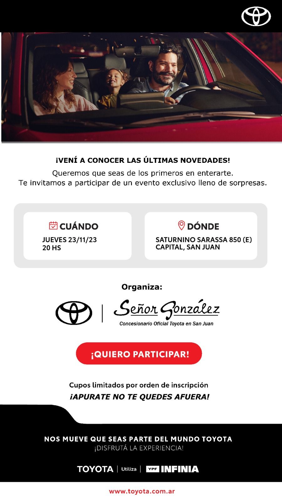 Jueves 23 de noviembre, a las 20 horas, en Señor González Concesionario Oficial Toyota en San Juan.
