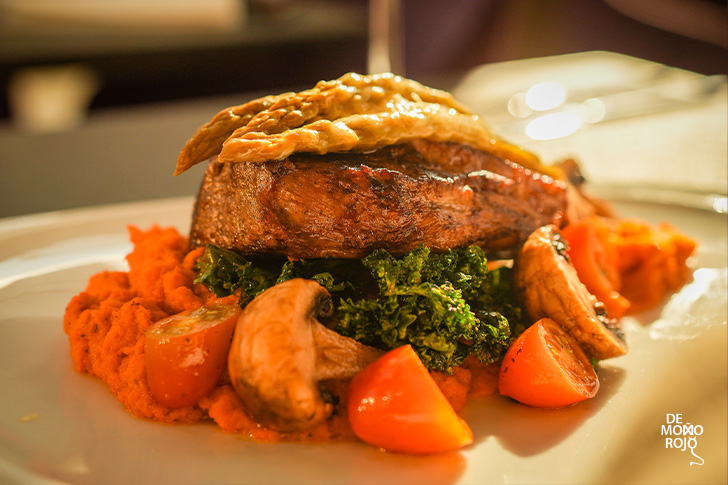 • Principales: Ojo de bife grillado en manteca de romero y ajos asados, sobre cremoso de remolacha y puré de zanahorias al tomillo, espárragos, garnish de cherry y crocante de batata. // Bondiolita de cerdo braseada acompañada por toffee de batata, orejones salteados en ron e hibiscus y reducción de frutos rojos al syrah. // Lasagna de hongos con cebolla salteada y muzzarella en salsa crema de alcachofa.
