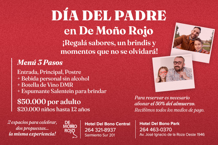 Con dos ubicaciones —en el Hotel Del Bono Park y en el Hotel Del Bono Central—, la marca invita a descubrir su propuesta exclusiva para el Día del Padre: menú de 3 pasos, con tres opciones de entradas, principales y postres, acompañado por bebidas sin alcohol, una botella de vino De Moño Rojo, brindis con espumante a cargo de Bodega Salentein y ¡regalo sorpresa para cada papá!