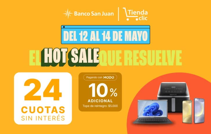 En el marco del Hot Sale, Banco San Juan y Tienda Clic lanzaron una propuesta imperdible para sus clientes. Durante los días 12, 13 y 14 de mayo, quienes compren en https://www.tiendaclic.com.ar/ utilizando tarjetas de crédito de Banco San Juan y pagando con MODO desde la app del banco, accederán a hasta 24 cuotas sin interés en todos los productos de la tienda, más un 10% de reintegro extra con tope de $5.000.