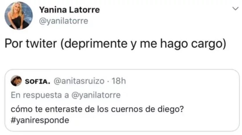 Si bien el drama quedó en el pasado, la panelista les permitió a sus seguidores que le hicieran preguntas a través del hashtag #yaniresponde. Una usuaria de Twitter, sin filtro, le consultó: "¿Cómo te enteraste de los cuernos de Diego?". Fiel a su estilo, lejos de darle la espalda a la pregunta, Yanina develó: "Por Twitter, fue deprimente y me hago cargo".