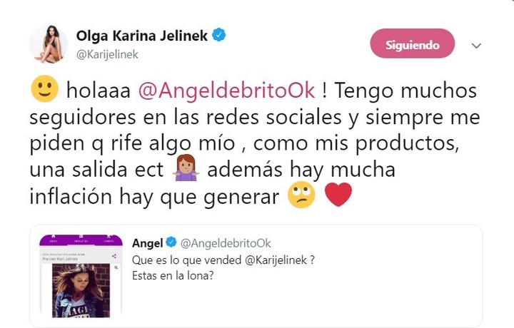"Que es lo que vendes @Karijelinek ? Estas en la lona?", le preguntó Ángel de Brito por Twitter, al descubrir la publicación.