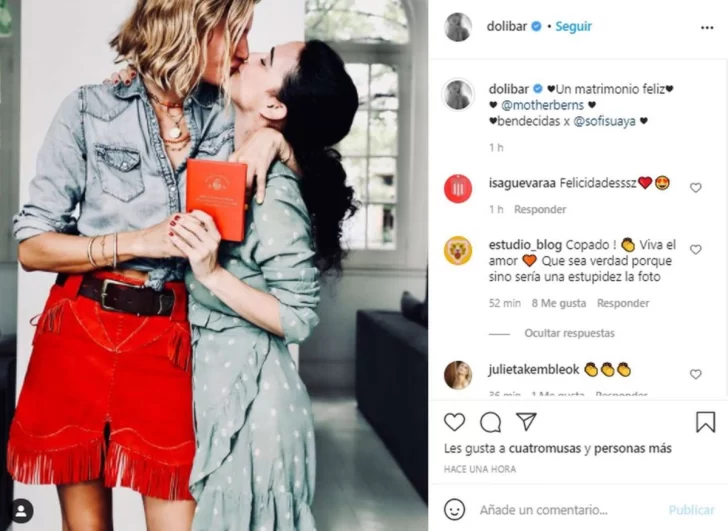 “Un matrimonio feliz. Bendecidas por Sofía Suaya”, fue la frase que la modelo agregó como descripción de la publicación. Allí se la ve con un look muy canchero besándose con una amiga, llamada Bernardita, mientras ambas sostienen una libreta roja de casamiento.
