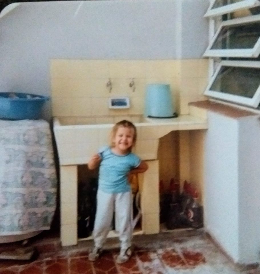 En los ’80, mis viejos alquilaban un departamento en Brasil y Sarmiento en el que pasé mi infancia. Fue mi parque de juegos, con una terraza enorme y ese lavadero hermoso que servía de decorado para mi incipiente histrionismo. Esta foto me recuerda cuánto me gustaba que me tomaran fotos, pero más me gusta ese lavadero súper humilde que da indicios de una familia en construcción. Además, todos los veranos de mi infancia se resumen en una palabra: Achiras. Mi abuela nació en "la linda del sur cordobés" y de diciembre a febrero aterrizábamos en la casa paterna. Fui realmente feliz en Achiras, quizás porque andaba en bombacha y en patas por la calle, como una nena de pueblo.