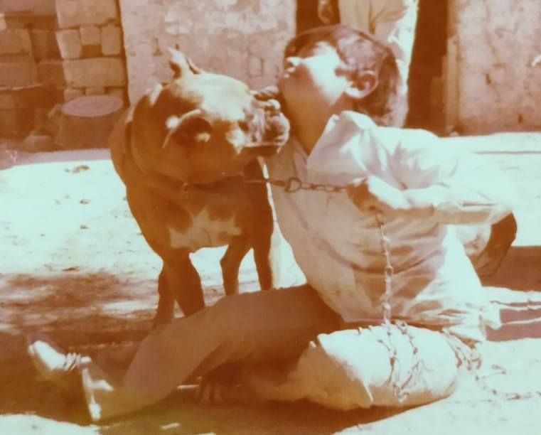 En una foto estoy tratando de parecerme a mi papá, jugando con su equipo transmisor de onda corta que él mismo armó. Crecí con el sonido de las válvulas encendiendo y el olor a estaño de la soldadura. Mi padre era un buscador de voces del universo, un ingeniero arreglador y yo descalibraba sus equipos en mi búsqueda. Al ver la otra foto, también percibo el olor del polvo en el que nos revolcábamos con los perros. Este bóxer y yo son una síntesis de mi vínculo perruno, heredado de mi madre, y uno de los pocos registros de la gran casa de mi abuela Coca, que sonaba a óperas y operetas españolas, olía a café y sabía a empanadas y jamón crudo. En su casa robé mi primer trago de vino y lo fui a escupir donde estaba el perro. Igual me descubrieron.
