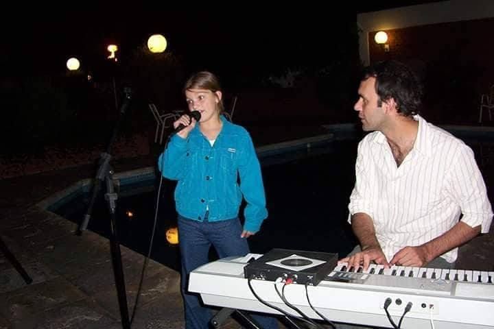 No sé por qué, pero tengo pocos recuerdos tan claros de mi infancia ¡y este es uno! Salgo con mi papá. Cuando yo era chica él estudiaba en Córdoba. Yo, que era hija única en ese momento, me quedaba con mi mamá ¡y lo extrañábamos mucho! Lo bueno era que siempre que volvía, venía con algún regalito para ambas. Esta foto es de un día que recién llegaba y la ropa que tengo puesta me la había traído él. Como siempre tan ansiosa, ¡ni bien me la dio ya la estaba usando! Y la otra foto es de uno de los últimos cumpleaños de mi bisabuela, "la baba". Fue una de las primeras veces que canté en público, con mi tío Lucio, con quien hasta hoy compartimos música y escenarios. Creo que canté "Un mundo ideal" de la película Aladin.