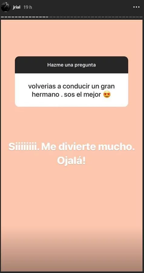 Por lo pronto, Jorge Rial reveló en su cuenta de Instagram si aceptaría estar nuevamente al frente del ciclo. "¿Volverías a conducir Gran Hermano?", le preguntó un seguidor. "Sí, me divierte mucho. ¡Ojalá!", respondió el periodista de espectáculos, que no hizo más que alimentar los rumores del regreso del famoso formato.