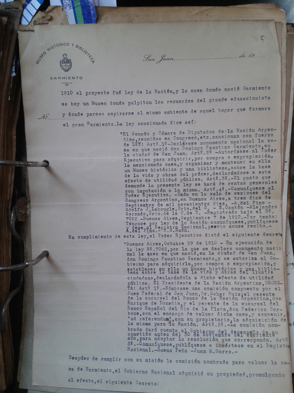 Se acercaba el primer centenario del nacimiento del prócer, y de un grupo de socios de la Biblioteca Franklin surgió la idea de intentar que la casona donde había nacido Domingo F. Sarmiento se convirtiera en un museo. De ese movimiento que fue escuchado por las autoridades locales y lo elevaron a la Nación, surgió la ley 7.062 fechada el 7 de septiembre de 1910 que declaró Monumento Histórico Nacional a la casa del expresidente argentino, para propiciar la difusión de su obra. Pero además fue el primero en el país y le permitió el año siguiente abrir como museo nacional, también ingresando en la lista de los pocos centros culturales de ese tipo.