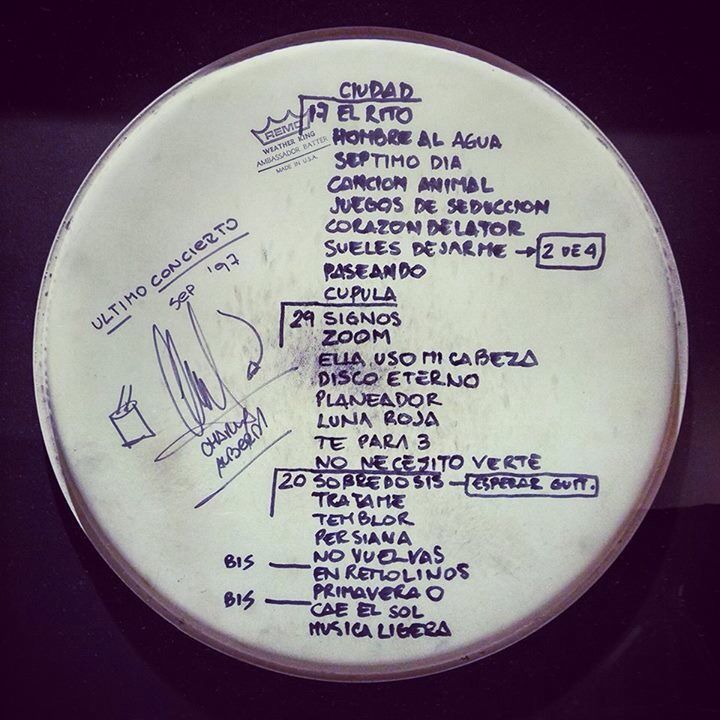 El set list. Alberti escribió en el parche de su batería los temas del concierto del 97. Él compartió la foto en su Facebook en 2014, el año que murió Cerati y se cumplían 17 años del concierto.