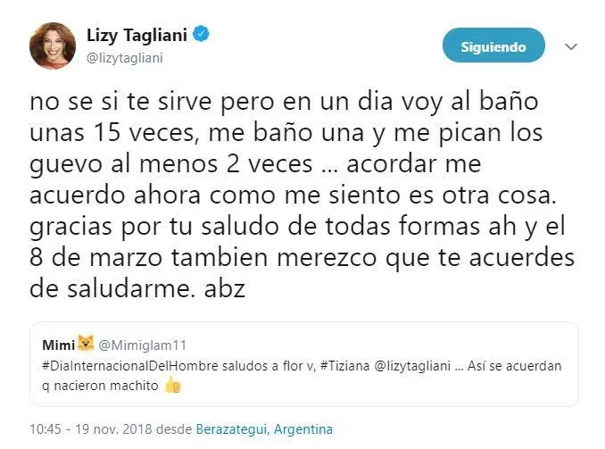 "#DíaInternacionalDelHombre saludos a Flor V, #Tiziana @lizytagliani… Así se acuerdan que nacieron machito", dice el tuit de un usuario que se hace llamar Mimi en el mundo virtual e indignó a la humorista.