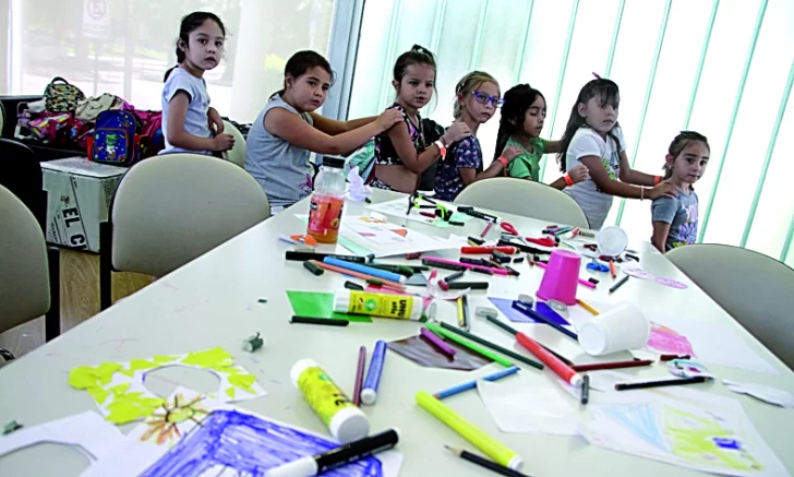 "Yo empecé con 6 y ahora tengo 7 y vengo con mi hermana que está en el grupo de los 9 y 10 años. Me gusta mucho dibujar y hacer amigas" dijo Emi desde la mesa que compartía con su amiga Pilar, Lisandro y Bautista, mientras la maestra llevaba las témperas para que pintaran.