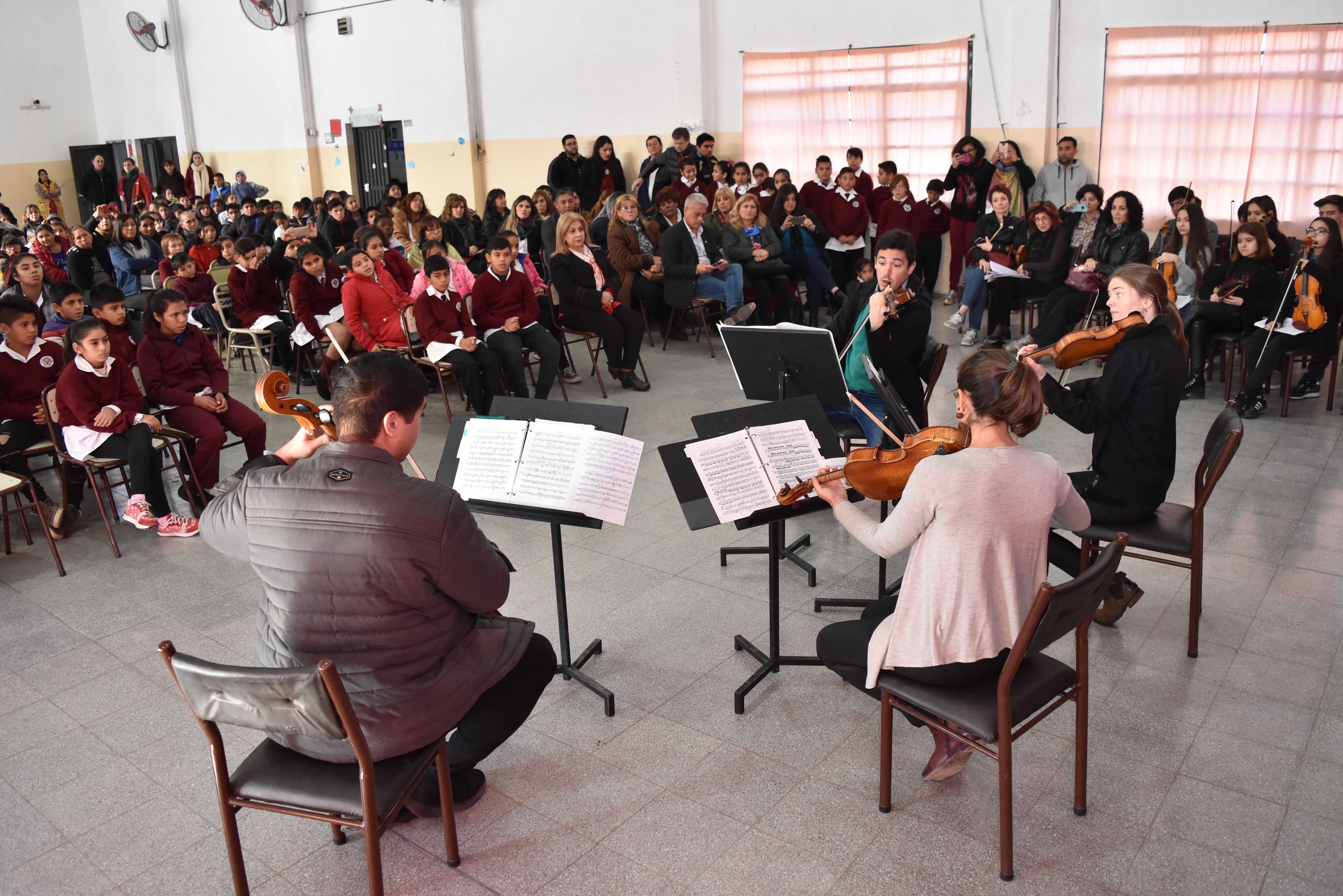 La paz que se sentía al escuchar las Sonatas de Corelli o los pizzicatos del cuarteto en Fa mayor de Maurice Ravel, contagió a más de 260 alumnos acompañados de padres y docentes, que por primera vez apreciaron cómo sonaba una orquesta de cámara en vivo y en su escuela. Ese momento único fue el resultado de la visita realizada ayer a la Escuela Domingo de Oro de Tupelí, en 25 de Mayo. Los Vera Quartet -Rebecca Anderson (violín), Pedro Rodríguez (violín), Inés Picado (viola) y Justin Goldsmith (cello)- unos 8 estudiantes de violín (pertenecientes a la Escuela de Música de la UNSJ) coordinados por Mimi Zweig y las autoridades del Teatro del Bicentenario, compartieron un intercambio musical con los alumnos del establecimiento. Es que, por su parte, los niños les dieron una afectuosa bienvenida con una demostración de flauta dulce; y sorprendieron gratamente con una versión instrumental de "Ojo de tigre", la original de Survivor, de la clásica banda sonora de la película Rocky III. Y después, engancharon un arreglo del tema Love me do de Los Beatles.