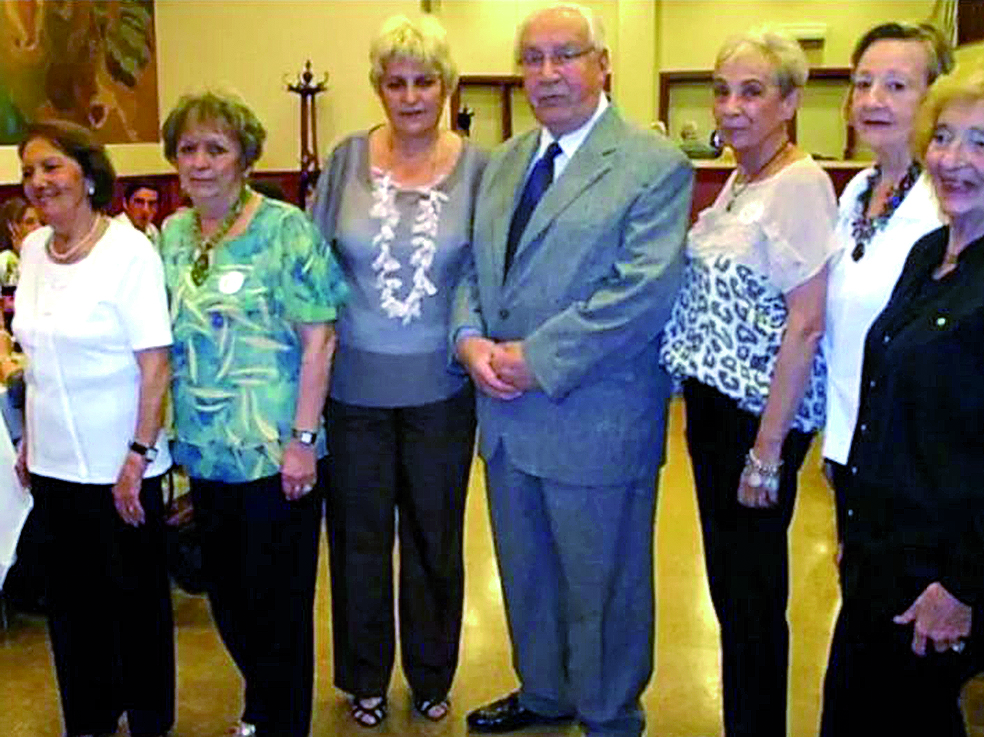 La comisión directiva de Protea durante un agasajo. De izq. a der. Haydeé Avendaño de González, Beatriz Premazzi de Tricoli, Susana Rosselot de Bettio, Eduardo Bettio, María Luisa González Aubone, Ada Guillermina Largacha de Balaguer y Amanda Baistrocchi de Seguí.