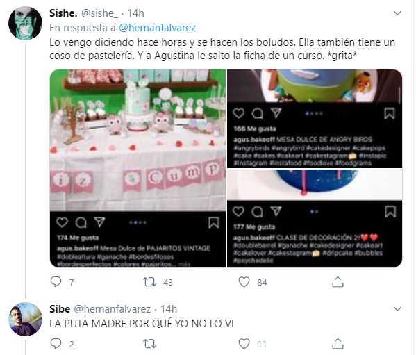 Otra usuaria mostró más evidencias que comprometen a Agustina y agregó fotos de las mesas dulces y de las tortas que la participantes promocionaba en su red social. “Lo vengo diciendo hace horas y se hacen los boludos. Ella también tiene un coso de pastelería. Y a Agustina le salto la ficha de un curso. grita”, escribió la denunciante junto a imágenes de tortas y dulces ofrecidos por Fontenla.