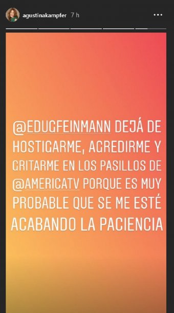 “Eduardo Feinmann dejá de hostigarme, agredirme y gritarme en los pasillos de América TVporque es muy probable que se me esté acabando la paciencia”, adelantó.