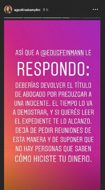 Este mensaje fue replicado por Kämpfer en sus historias de Instagram y respondido inmediatamente: “Deberías devolver el título de abogado por prejuzgar a una inocente. El tiempo lo va a demostrar y si querés leer el expediente te lo alcanzo”.