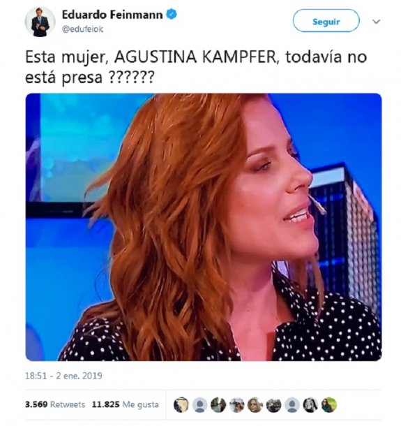 De un tiempo a esta parte, Agustina Kämpfer es cuestionada con frecuencia por Eduardo Feinmann en las redes sociales, con posteos que suelen incluir imágenes de la panelista y mensajes como el siguiente: “¿Esta mujer, AGUSTINA KÄMPFER, todavía no está presa?”.