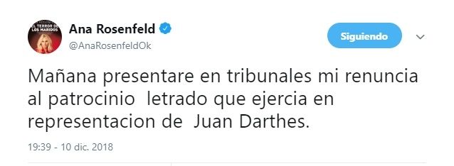 El mensaje llegó contundente y en pocos caracteres: "Mañana presentaré en Tribunales mi renuncia al patrocinio letrado que ejercía en representación de Juan Darthés", escribió refiriéndose a este martes 11 de diciembre.