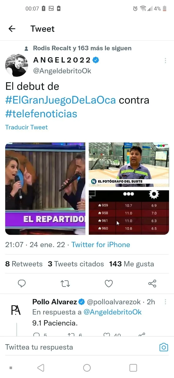 El primero de los posteos de Ángel tuvo que ver con una nueva producción comandada por el Pollo Álvarez y Dany La Chepi, "El Juego de la Oca" donde el conductor mencionó el bajo rating del debut contra el noticiero de Telefe.