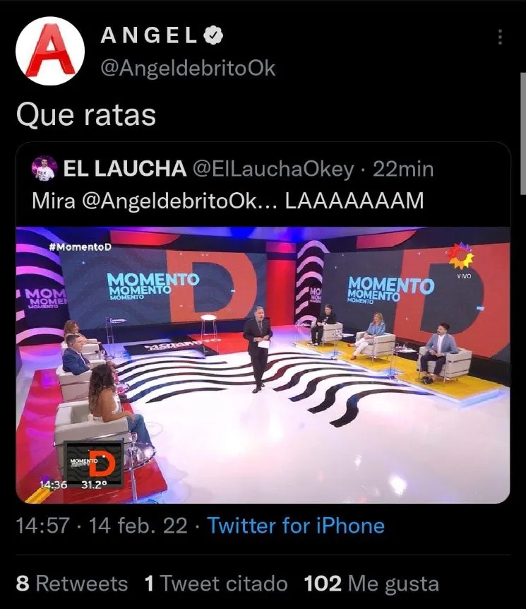 Luego fue una publicación sobre el nuevo programa vespertino que trae de regreso a Fabián Doman con un panel ecléctico llamado "Momento D", donde un seguidor le mostraba a De Brito que la escenografía de la nueva apuesta de El Trece era muy similar a la de LAM, a lo que De Brito, no dudó en responder con un "Ratas".