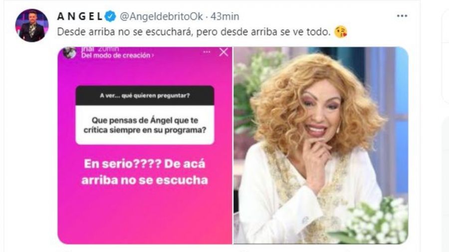 Recogiendo el guante, Ángel de Brito replicó la historia de Instagram con el comentario de Rial y puso: "Desde arriba no se escuchará, pero desde arriba se ve todo", escribió y sumó una foto de la última vez que Beatriz Salomón estuvo en la mesa de Mirtha Legrand, recordando el juicio y la conflictiva relación entre la fallecida vedette y el ex conductor de Intrusos, a quien maldijo en vida.