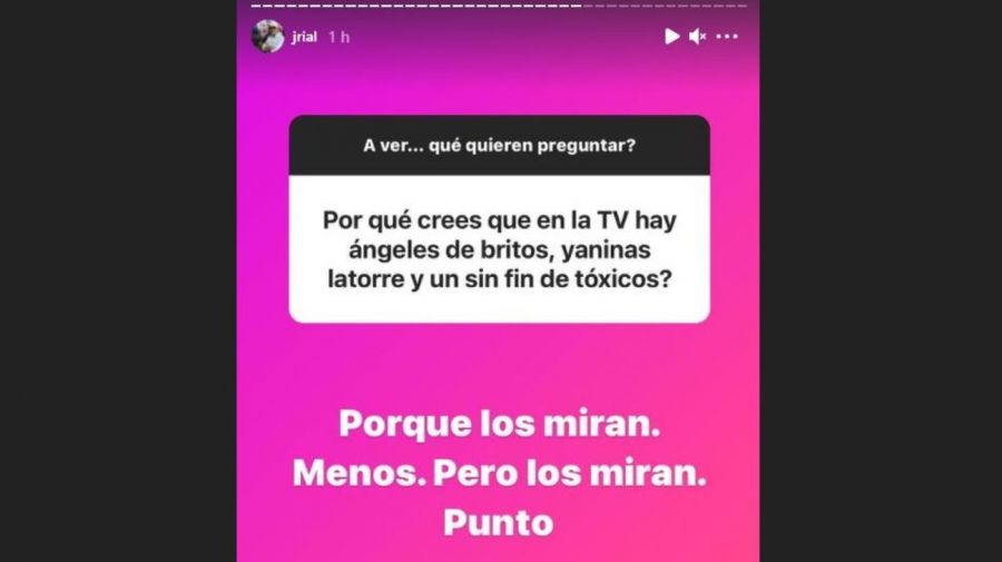 Pero el tema no quedó ahí. Rial también respondió cuando le preguntaron "¿Por qué creés que en la TV hay Ángeles de Britos, Yaninas Latorre y un sin fin de tóxicos?". Nuevamente chicaneándolo con el rating de LAM, dijo: "Porque los miran. Menos. Pero los miran. Punto".