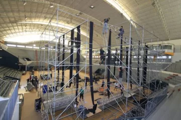 Desde las 11 de la mañana de ayer y en tiempo récord, llegó el equipo logístico y técnico de Ideas del Sur en dos camiones con todo lo necesario para montar un gigantesco escenario y los sistemas de iluminación, sonido y video, con lo que contará la producción del programa "Soñando por cantar’ esta noche. Un grupo de más de 40 operarios estuvo trabajando a contrarreloj para el armado de toda la escenografía, que está montada mirando para la calle San Luis, en el interior de la cancha de hockey. Se implementó un 30% más de equipamiento respecto al año pasado y el operativo contó con la colaboración de Hugo Di Bernardo para la instalación y armado del escenario. Hay 50 paneles LED, 28 móviles de iluminación con sus correspondientes reflectores, en una estructura (más grande que la anterior) de 15 metros de ancho por 10 metros de altura. Se trabajará con 8 cámaras que filmarán en formato HD. Todos los sistemas estarán conectados a una fuente de alimentación eléctrica con dos generadores de 275 kVA de alta potencia.