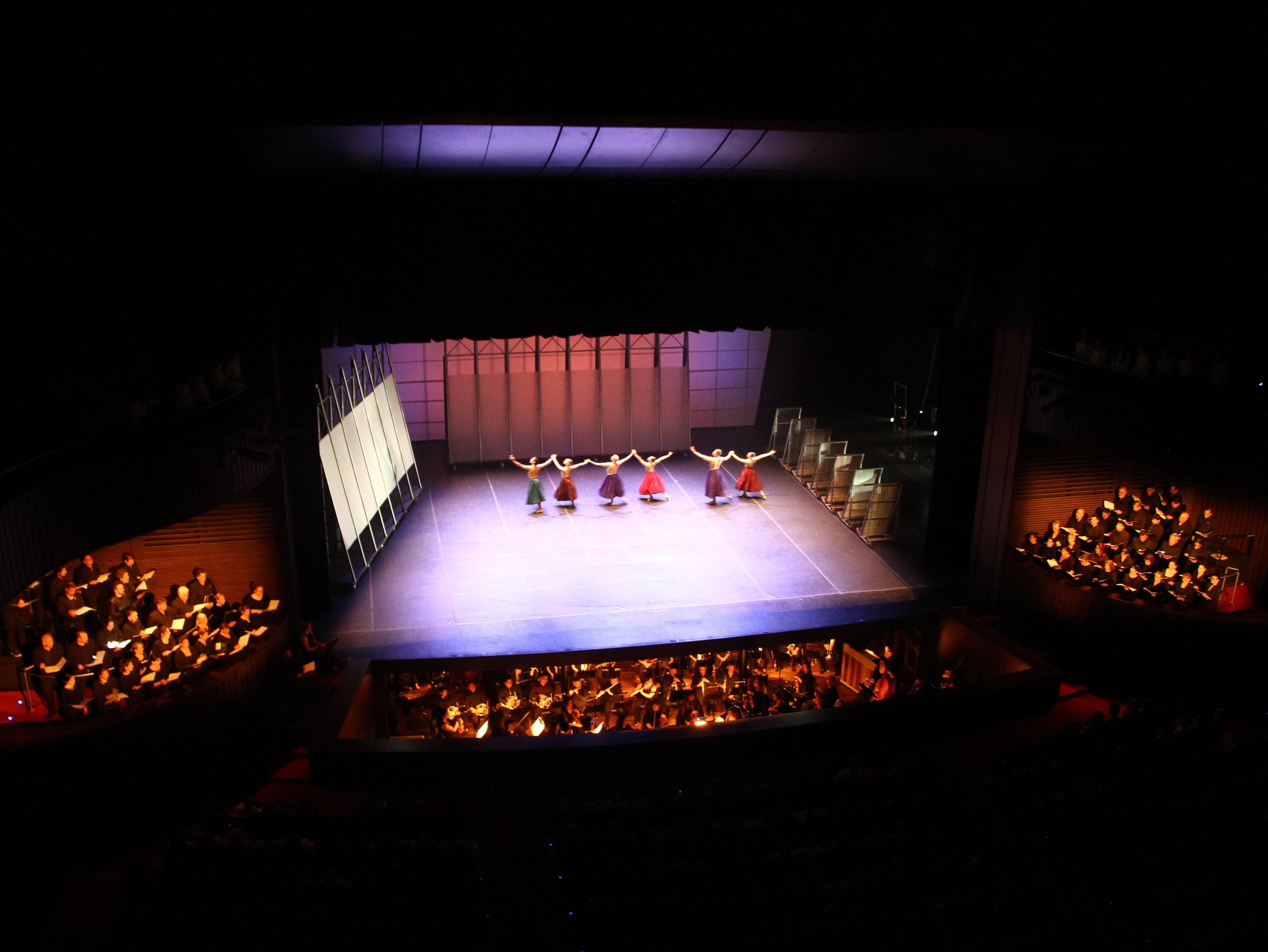 La danza se funde en la música ejecutada magistralmente por la Sinfónica de la UNSJ, dirigida por el maestro alemán Wolfgang Wengenroth; como también fue impecable la participación de los cantantes líricos invitados: el barítono Alfonso Mujica (Uruguay), la soprano Laura Pisani y el contratenor Martín Barrera Oro (ambos de Buenos Aires). La ubicación de los coros fue un desafío, porque se dispuso que estuvieran en los palcos a los lados del escenario. Desde ahí, mucho más cerca de la platea, ambas formaciones mostraron toda su potencia vocal.