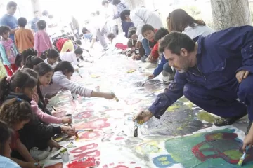 Al principio estuvieron muy tímidos para expresarse, pero de a poco tomaron confianza. Cuando el pintor chaqueño abrió los tarros de latex y repartió los pinceles, se le vino encima una avalancha de niños ansiosa por dibujar. Con los rostros y manos pasados por pintura, los chicos pintaron sobre el lienzo de más de 15 metros extendido por la entrada a la escuela. En cuclillas y con el pincel en mano, la creatividad y los colores brotaron de ellos armando figuras y formas diversas sin respetar orden o regla. Cada uno jugaba a ser artista con azules, rojos, amarillos, verdes y negros. Desde una casa, pelotas, autos, el escudo de San Martín hasta lo más abstracto emanaba de su imaginación. Al final, el artista les regaló un cuadro suyo titulado "Rey de Corazones".
