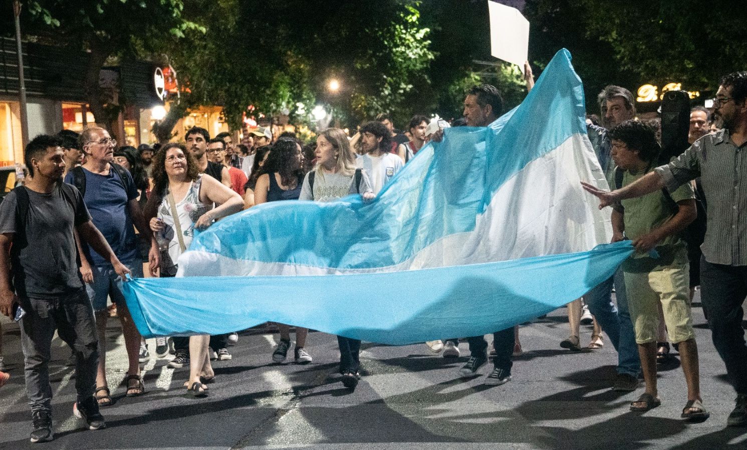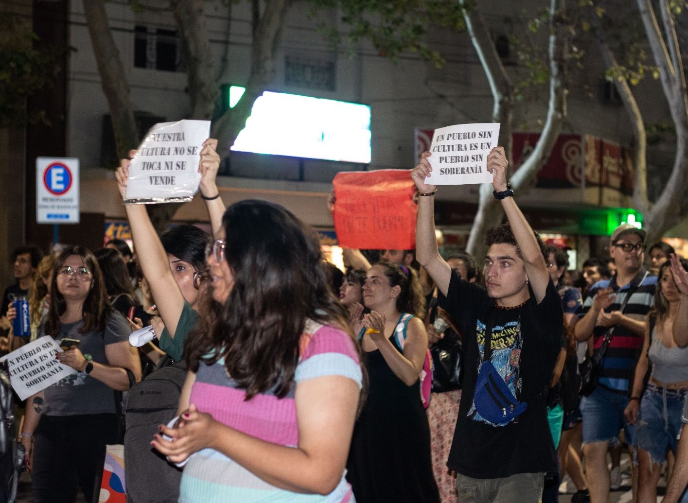 Sobre el final de la jornada, marcharon alrededor de la plaza con carteles, banderas, cacerolas, redoblantes, repiques y cánticos, esgrimiendo consignas como ‘La cultura no es un negocio’ y ‘La patria no se vende, el pueblo está que arde’.