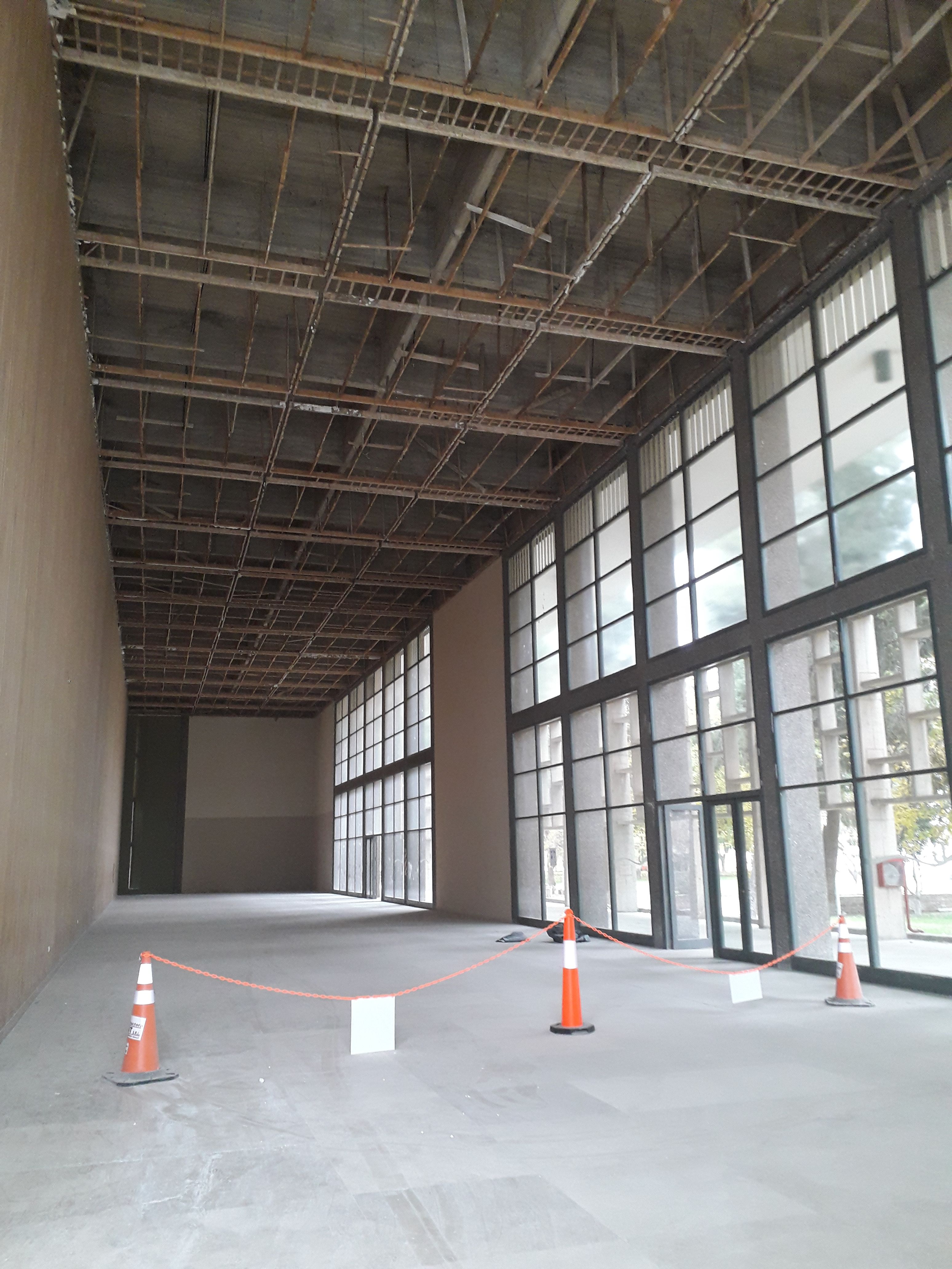 Obra. Izq. Vista del Foyer norte aún con los bastidores de madera. Arriba: las lámparas fueron almacenadas en el ex café del Auditorio.