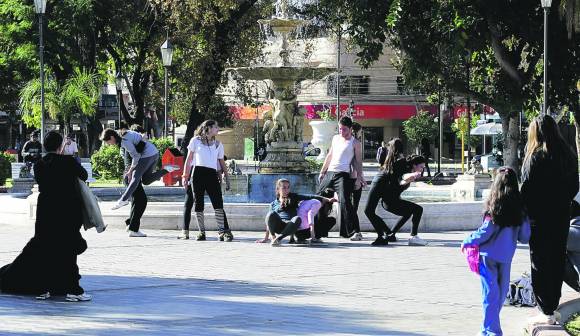 Y el disparador fue el frío. Sin poder despegarse de los buzos, uno dijo "sería bueno hacer clase en la plaza, con el solcito"… Y del dicho al hecho no pasó mucho. Ayer por la siesta, bajo el cálido sol sanjuanino, una decena de bailarines del Taller de Danza Contemporánea que Julia De Nardi dicta en el Teatro Municipal, hizo de las suyas en la Plaza 25 de Mayo. Ya cuando cruzaron la calle Mitre en sus ropas de ensayo, comenzaron a llamar la atención. Y más cuando empezaron la práctica a los ojos de todos, en distintos rincones del espacio público. Un señor de edad se sentó y les sacó un par de fotos con su celular a los jóvenes que iban deslizando sus cuerpos sobre los bordes de la fuente -incluso tocando el agua-; y la mujer con la nena también se detuvo a contemplar la inusual escena, mientras una señora de bolsa en la mano pasaba casi por el medio, prácticamente indiferente a la intervención artística. Los que también se quedaron mirando fueron los habitués de la plaza, estudiantes secundarios que observaban atentos al intruso grupo de artistas.