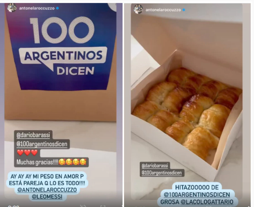 Antonela grabó los obsequios y agradeció públicamente al conductor y al equipo del programa en sus redes sociales. Rápidamente, Barassi compartió las historias y bromeó: “Ay, mi peso en amor por esta pareja que lo es todo”.
