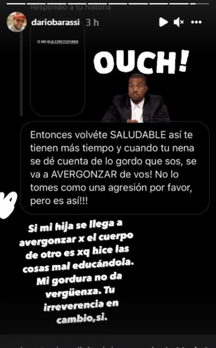 Darío Barassi (37) explotó contra una seguidora de Instagram que le recomendó adelgazar para no "avergonzar" su hija de dos años, Emilia.