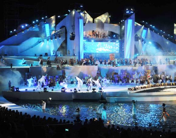 Esa gesta emancipadora con el pueblo como protagonista, se vivió reflejada en varios cuadros sobre los cerros aledaños con buen despliegue escenográfico. Los colores celeste y blanco predominaron durante toda la fiesta y lograron su máxima expresión casi al finalizar el espectáculo. Se destacó una puesta en escena prolija, coordinada y con buena musicalización -gran parte de ella con músicos en vivo- acompañada por el diseño de un decorado dinámico que combinó la tecnología propia de las cajas lumínicas con los avances de la electrónica.