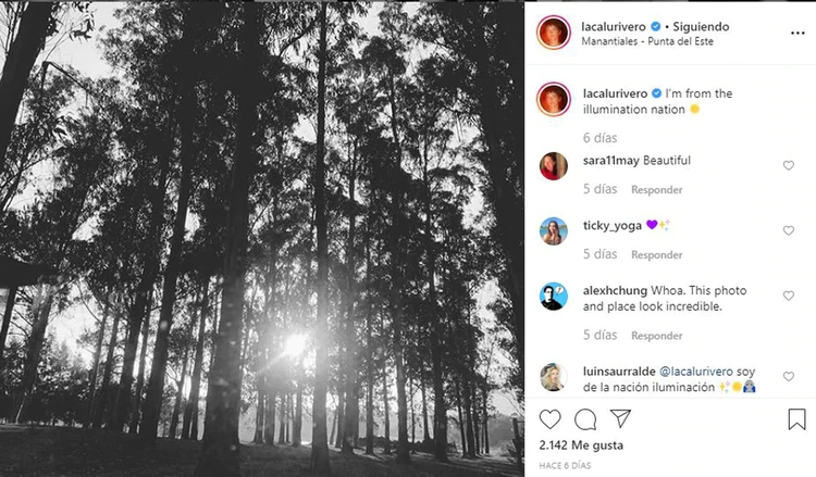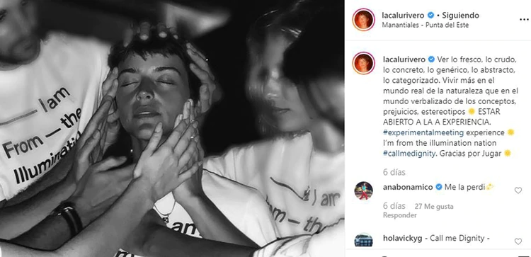 Calu Rivero publicó varios mensajes en su cuenta de Instagram que llamaron la atención de sus seguidores. La joven, que decidió empezar a llamarse Dignity, posteó diversas fotos desde Punta del Este, donde se la ve realizando experiencias espirituales con varias personas y con particulares mensajes. Todas las fotos las subió en blanco y negro, y se mostró con una remera en inglés que señala “I’m from the illumination nation” (Mi nación es la iluminación).