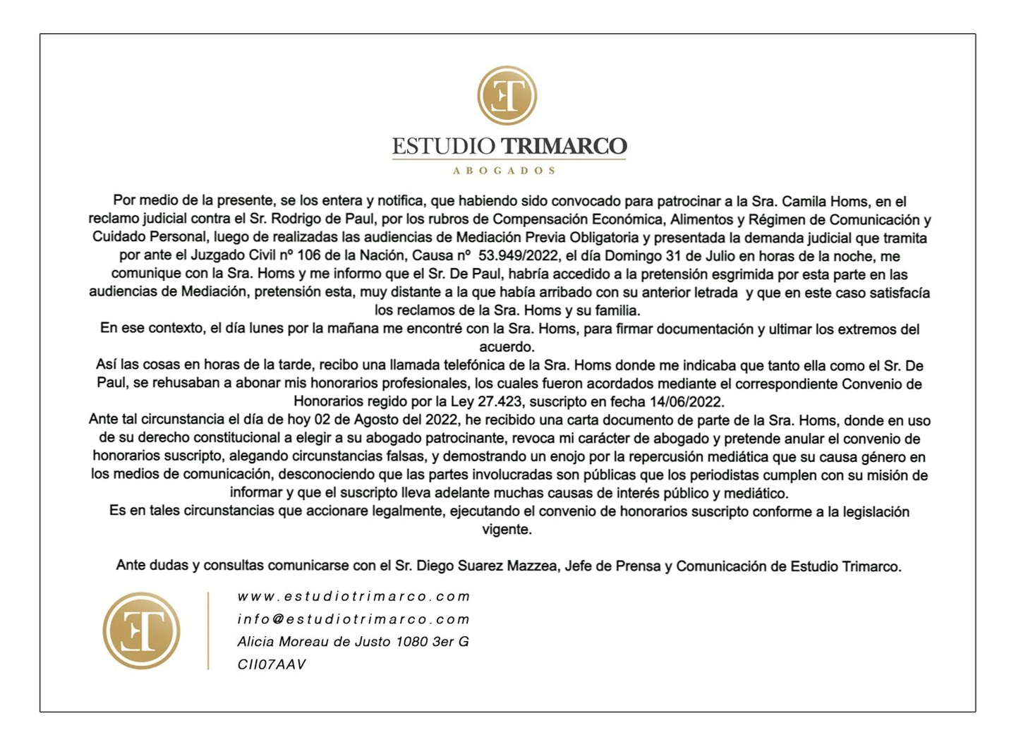 “El día 2 de agosto del 2022, he recibido una carta documento de parte de la Sra. Homs, donde en uso de su derecho constitucional a elegir a su abogado patrocinante, revoca mi carácter de abogado y pretende anular el convenio de honorarios suscripto, alegando circunstancias falsas y demostrando un enojo por la repercusión mediática que su causa generó en los medios de comunicación”, se lee en la misiva.