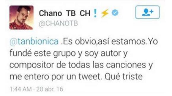 ‘Es obvio, así estamos. Yo fundé este grupo y soy autor y compositor de todas las canciones y me entero por un tweet. Qué triste’, hizo catársis el músico respondiéndole al perfil de Twitter oficial de su propia banda desde su cuenta personal. Tras unos minutos, se arrepintió y borró el mensaje, el cual quedó registrado gracias a las capturas de los usuarios que se divirtieron con el ataque de histeria de Chano.