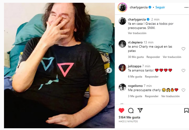 Inmediatamente, llegaron los mensajes de los fanáticos que comentaron con alegría sobre la recuperación de Charly: “Te amo Charly me cagué en las patas”, “Me preocupaste Charly”, “Rezo mucho por Charly y agradecido por todo lo que es”, “Ver tu foto mientras te estoy escuchando, por supuesto. Ojalá fueras eterno”, “No me asustes más que jamás voy a estar preparado”.