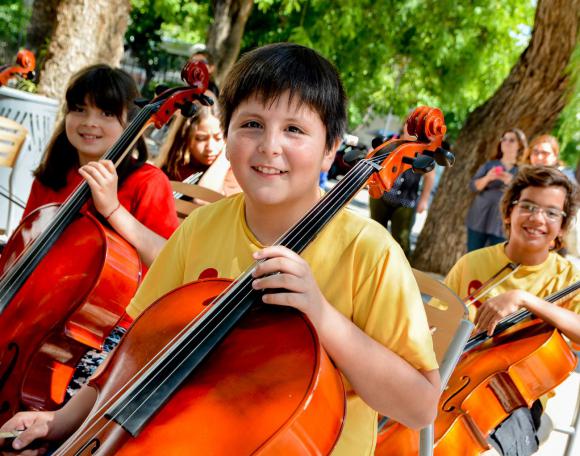 Integrantes del programa Orquestas Escuela San Juan coparon la Peatonal Maestro de América ayer y deleitaron a turistas y transeúntes con su música. Más de treinta niños, que son parte de un colectivo de más de 120 distribuidos en seis núcleos en Rawson, Sarmiento, Rivadavia y Capital, ejecutaron obras clásicas y populares interpretadas con violín, viola y violoncello.