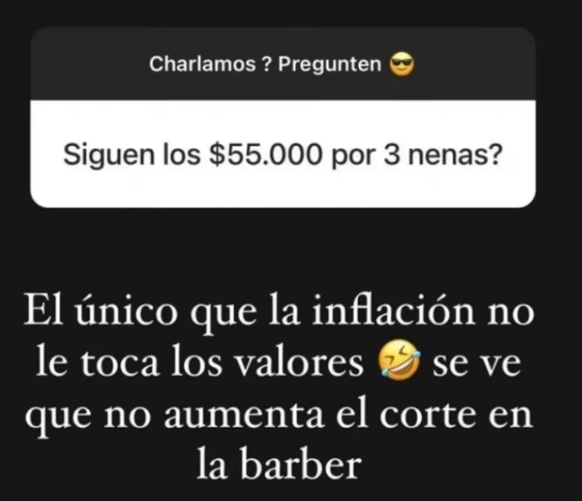 En un juego de preguntas y respuestas con sus seguidores, contó que le sigue enviando 55 mil pesos, que no le alcanzan para nada. “El único al que la inflación no le toca los valores… Se ve que no aumenta el corte en la barbería”, disparó indignada haciendo alusión al ingreso probable que tiene el deportista, que montó un local para hombres en una popular avenida de Villa Urquiza.