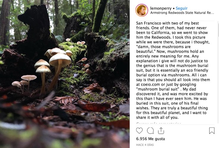 "Ninguna explicación que pueda dar hará justicia a lo fantástico que es el entierro en un traje de hongos, pero es básicamente una opción de entierro ecológica a través de los hongos", posteó su hija desde la Reserva Natural de Armstrong Redwoods State, en California.