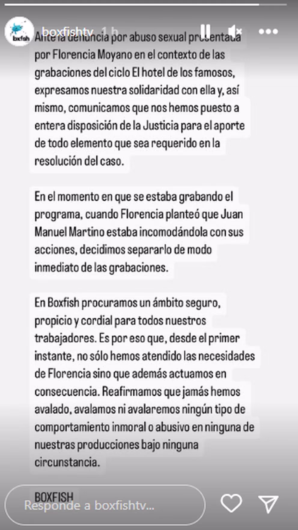 Y continuó con lo siguiente: “En el momento en que se estaba grabando el programa, cuando Florencia planteó que Juan Manuel Martino estaba incomodándola con sus acciones, decidimos separarlo de modo inmediato de las grabaciones. En Boxfish procuramos un ambito seguro, propicio y cordial para todos nuestros trabajadores. Es por eso que, desde el primer instante, no solo hemos atendido las necesidades de Florencia sino que además actuamos en consecuencia. Reafirmamos que jamás hemos avalado, avalamos ni avalaremos ningún tipo de comportamiento inmoral o abusivo en ninguna de nuestras producciones bajo ninguna circunstancia.”