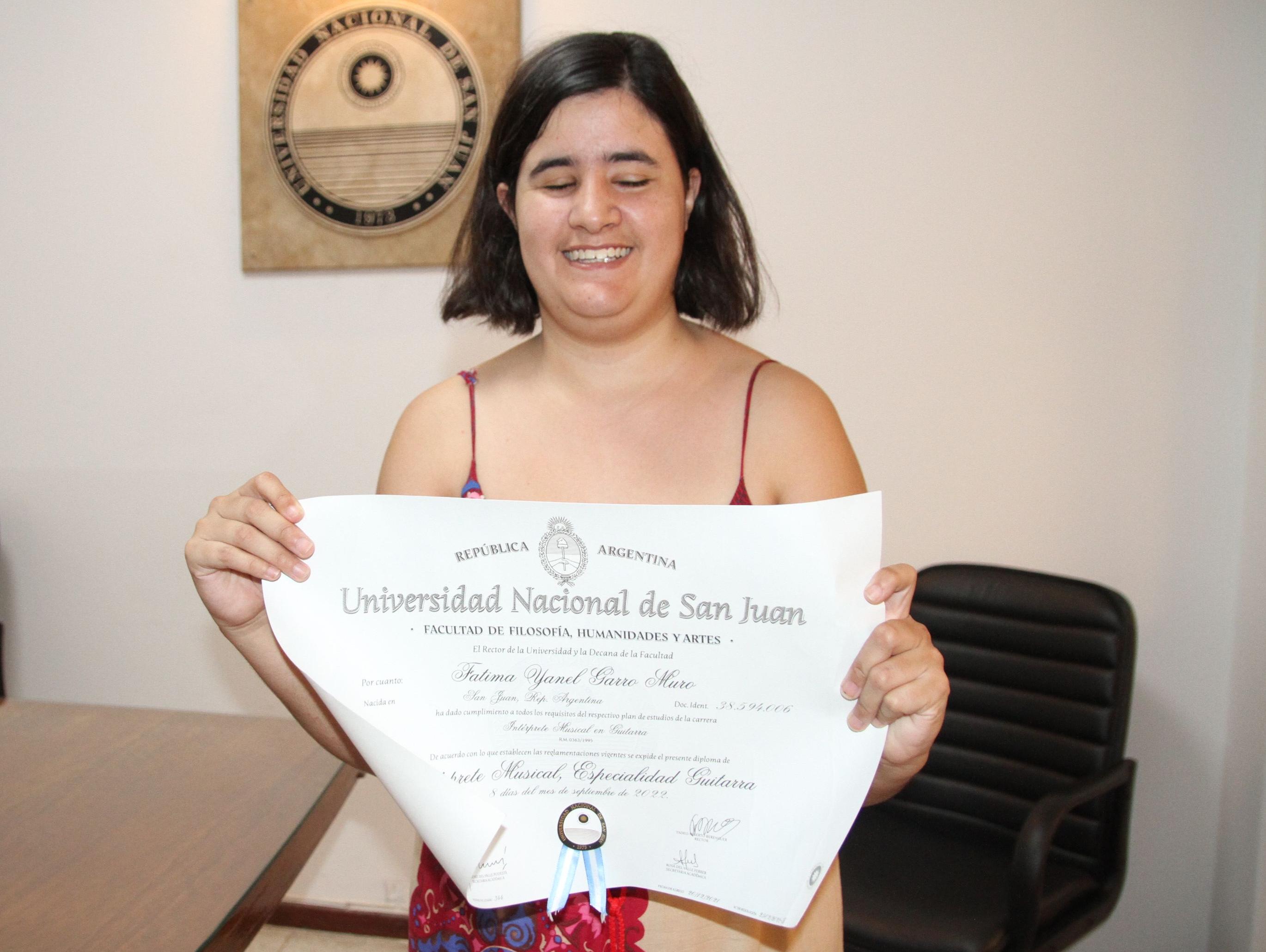 Conocida en la provincia, Fátima Garro egresó hace un par de años, pero recién ayer recibió su título en San Juan, ya que hace tiempo está radicada en Buenos Aires, donde integra el cuerpo estable del Coro Polifónico Nacional de Ciegos y estudia; por eso no le había sido posible coincidir con su correspondiente acto de colación. Ahora, diploma en mano, es oficialmente "Intérprete Musical, Especialidad Guitarra", egresada de la Escuela de Música de la FFHA (UNSJ). Es un logro que la colma de felicidad, especialmente por dos motivos, tal como ella misma destacó. Por un lado, le permite continuar su carrera profesional en la Capital. Y por otro, es un símbolo de que "se puede", tal como subrayó la resiliente y perseverante profesional, quien habló con DIARIO DE CUYO.